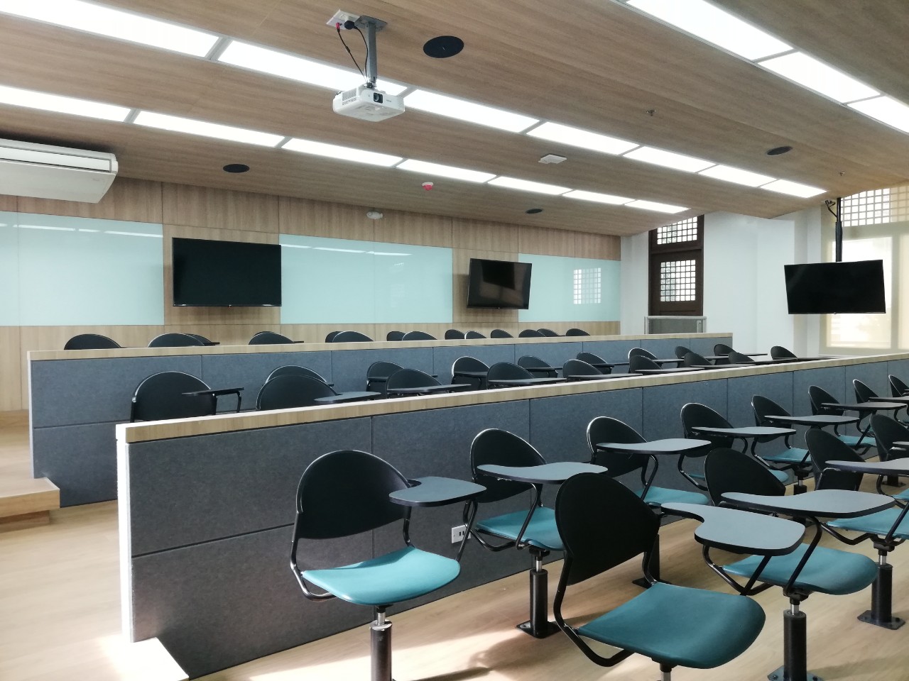 Case Room B features layered conference tables and chairs, each with a retractable smart TV. These devices are linked to the main TV and projector used by the lecturer or facilitator.